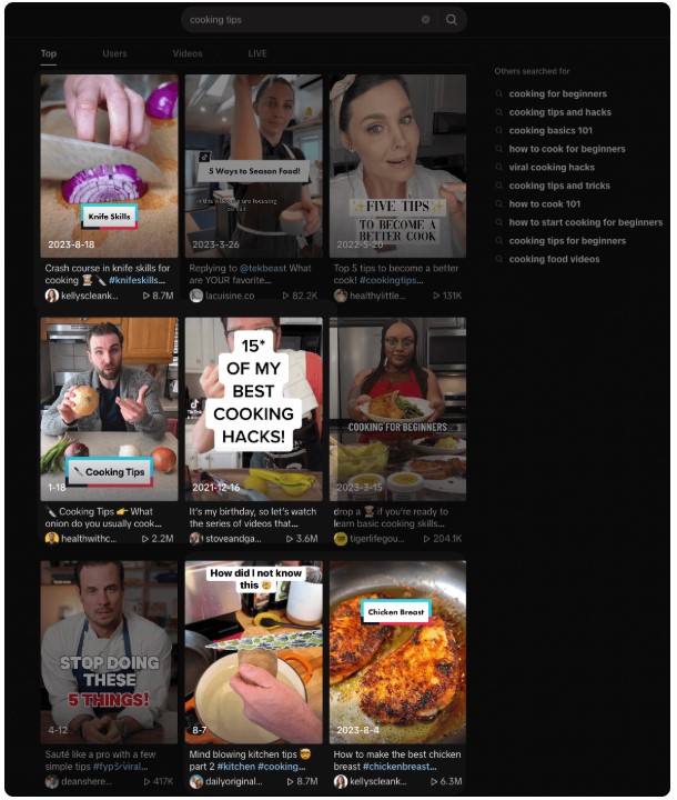 Kiedy wyszukałem na TikToku frazę „cooking tips”, znalazłem filmy z ponad milionem wyświetleń. Wszystkie one:
