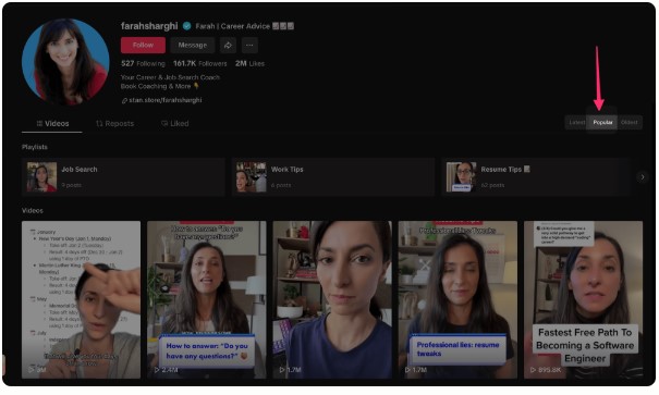 Użyj zakładki „Popular” na dowolnym koncie TikTok, aby natychmiast znaleźć najlepiej działające filmy każdej osoby.