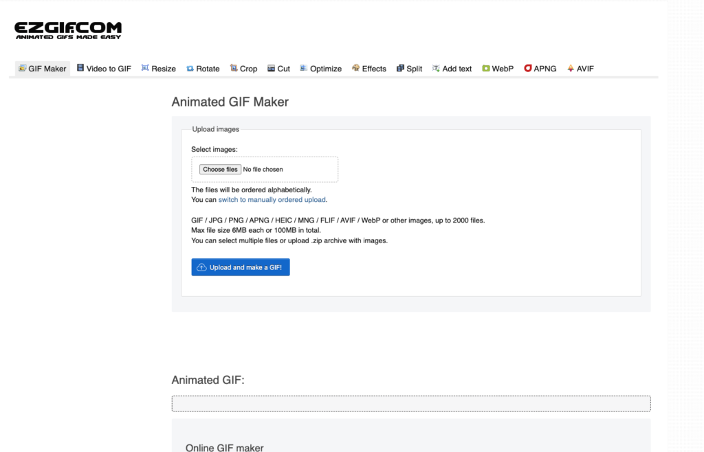 Jeśli masz milion plików i lubisz kombinować — Ezgif jest dla Ciebie. Możesz wrzucić nawet 2000 obrazów (do 100 MB łącznie), więc miejsca na eksperymenty nie zabraknie.