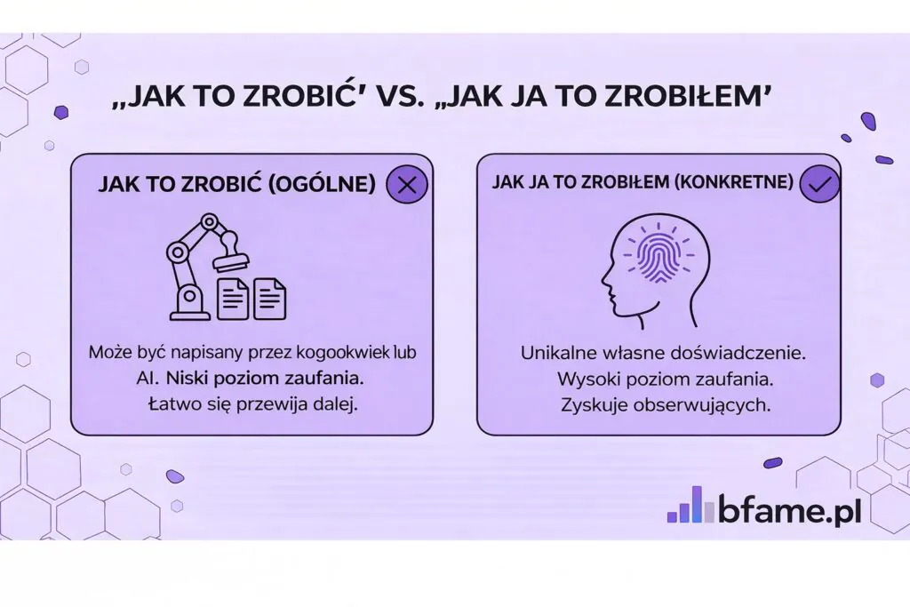 Posty oparte na osobistym doświadczeniu i konkretnym wniosku — czyli tzw. format „How I” — regularnie osiągają lepsze wyniki niż ogólne treści edukacyjne, ponieważ oferują perspektywę, której nie może dostarczyć nikt inny.