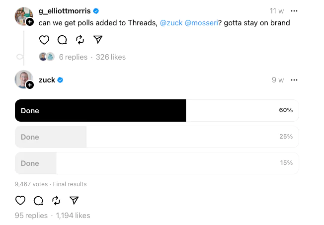 Kiedy Threads uruchomił ankiety, Mark Zuckerberg podzielił się żartobliwą odpowiedzią na ankietę użytkownikowi, który o nie poprosił. Jego ankieta nie miała wątpliwości-tylko trzy opcje: „gotowe”, „gotowe” i „gotowe.”