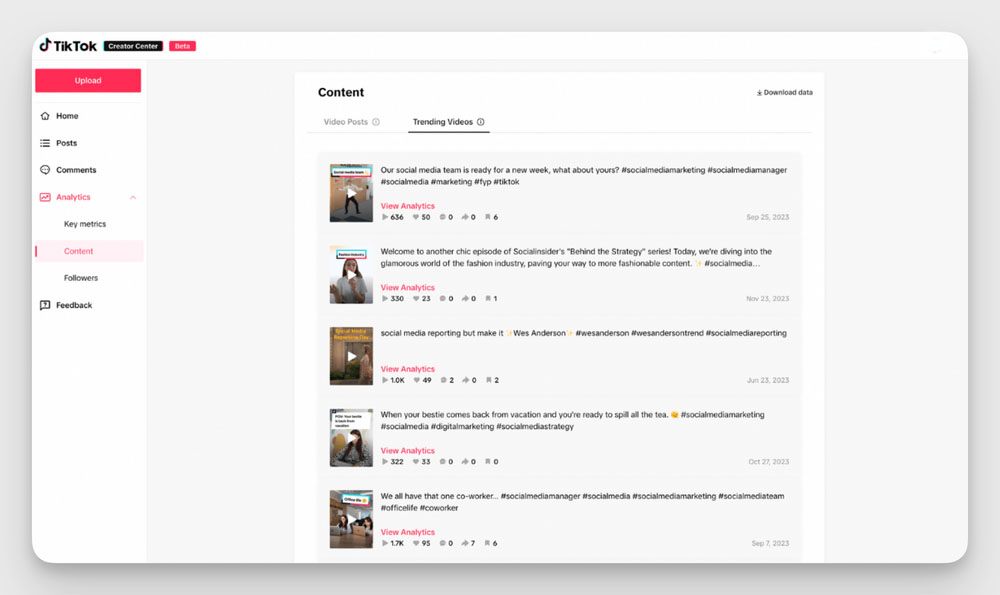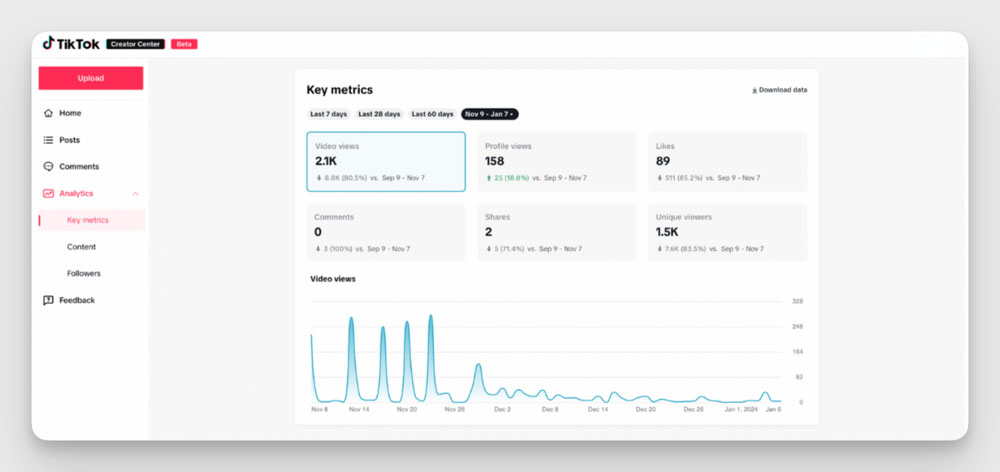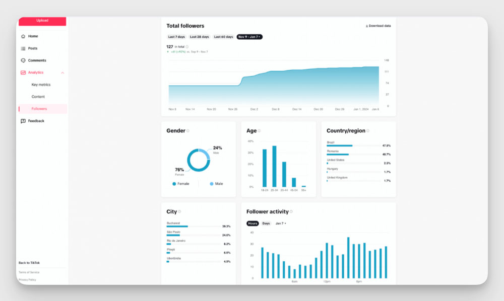 W aplikacji analitycznej TikTok możesz sprawdzać dane z ostatnich 60 dni. Najważniejsze z nich to: